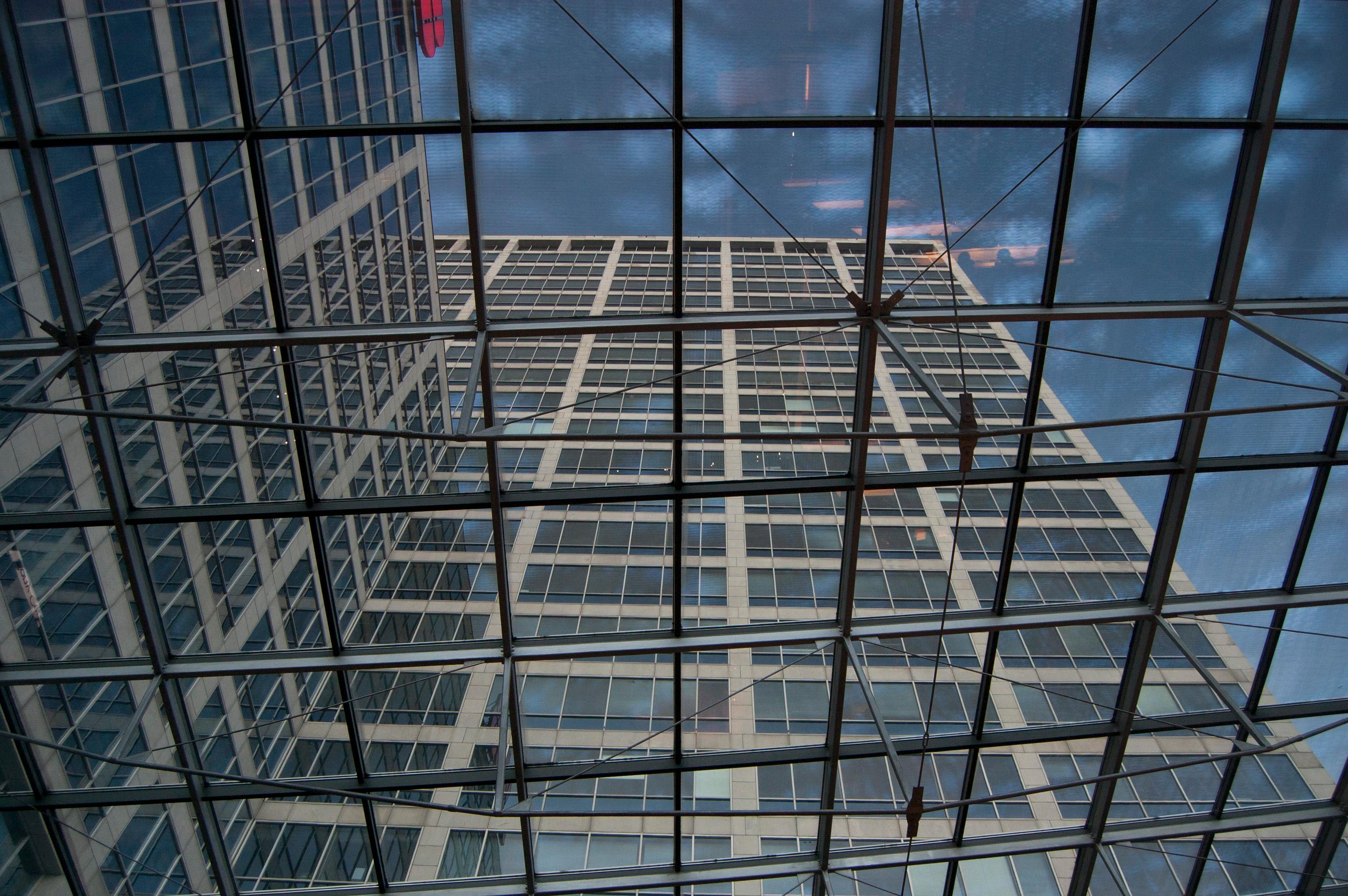 A modern building consists of three, joined, 18 and 29- floor high structures.