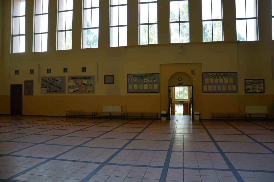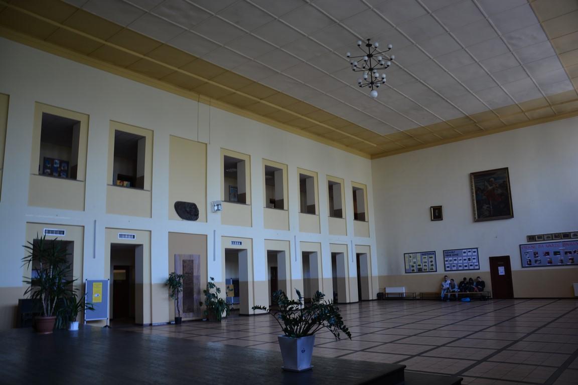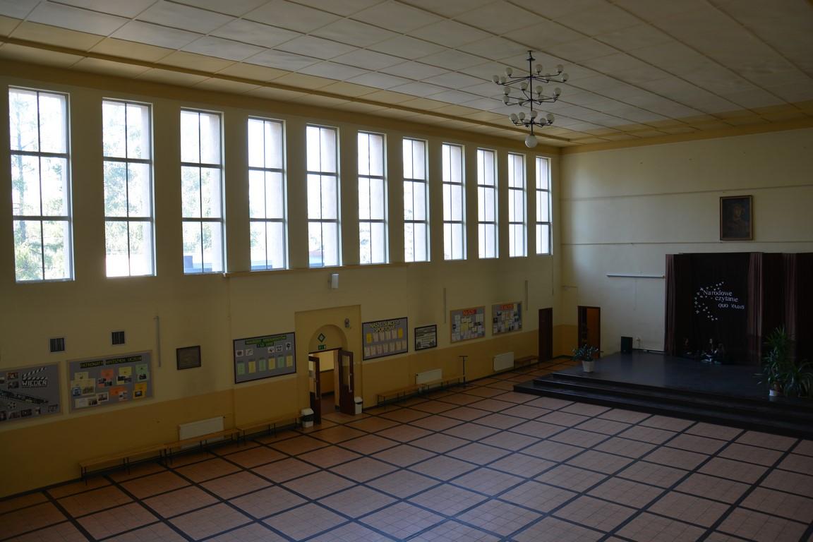 An assembly hall is located in one of the high schools in Będzin. The room is high, wide and spacious. It is well lit thanks to the great number of windows. A platform, where numerous shows and school ceremonies take place, has been built in the middle of the hall.