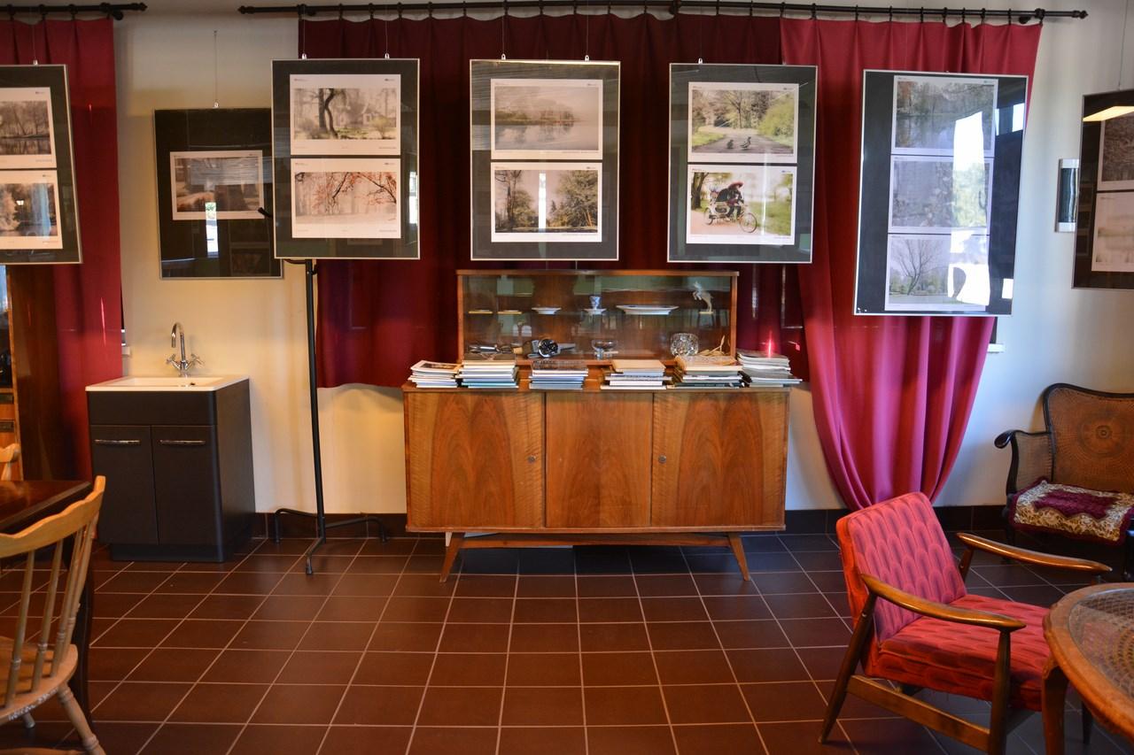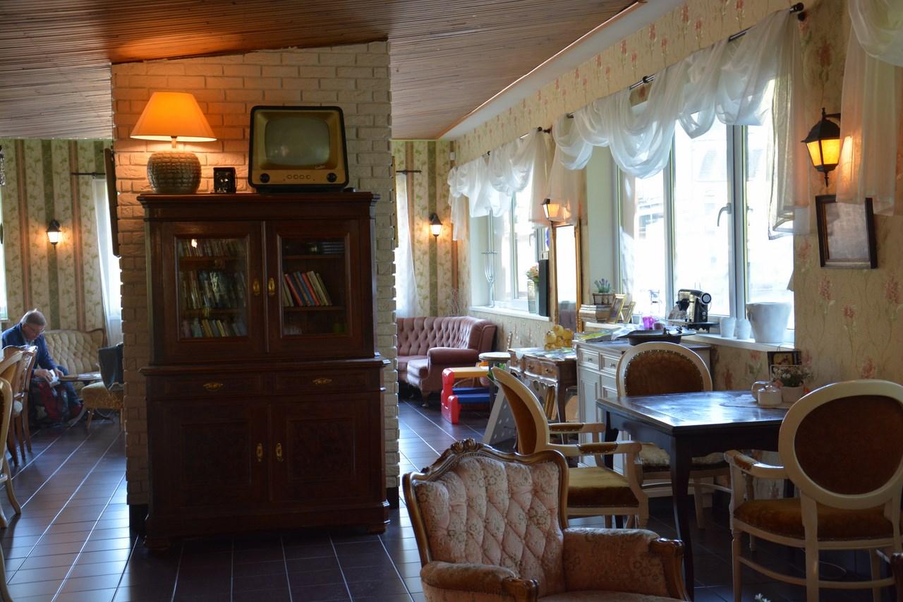 A specific, open-space interior makes the whole place charming. There are tables with chairs situated at the railings with a view of the ground floor and at the windows. On the walls there are paintings, wall lamps and a photo gallery. The interior has been filled with many sofas, tables and furniture from the Polish People Republic period (display case, wall unit).