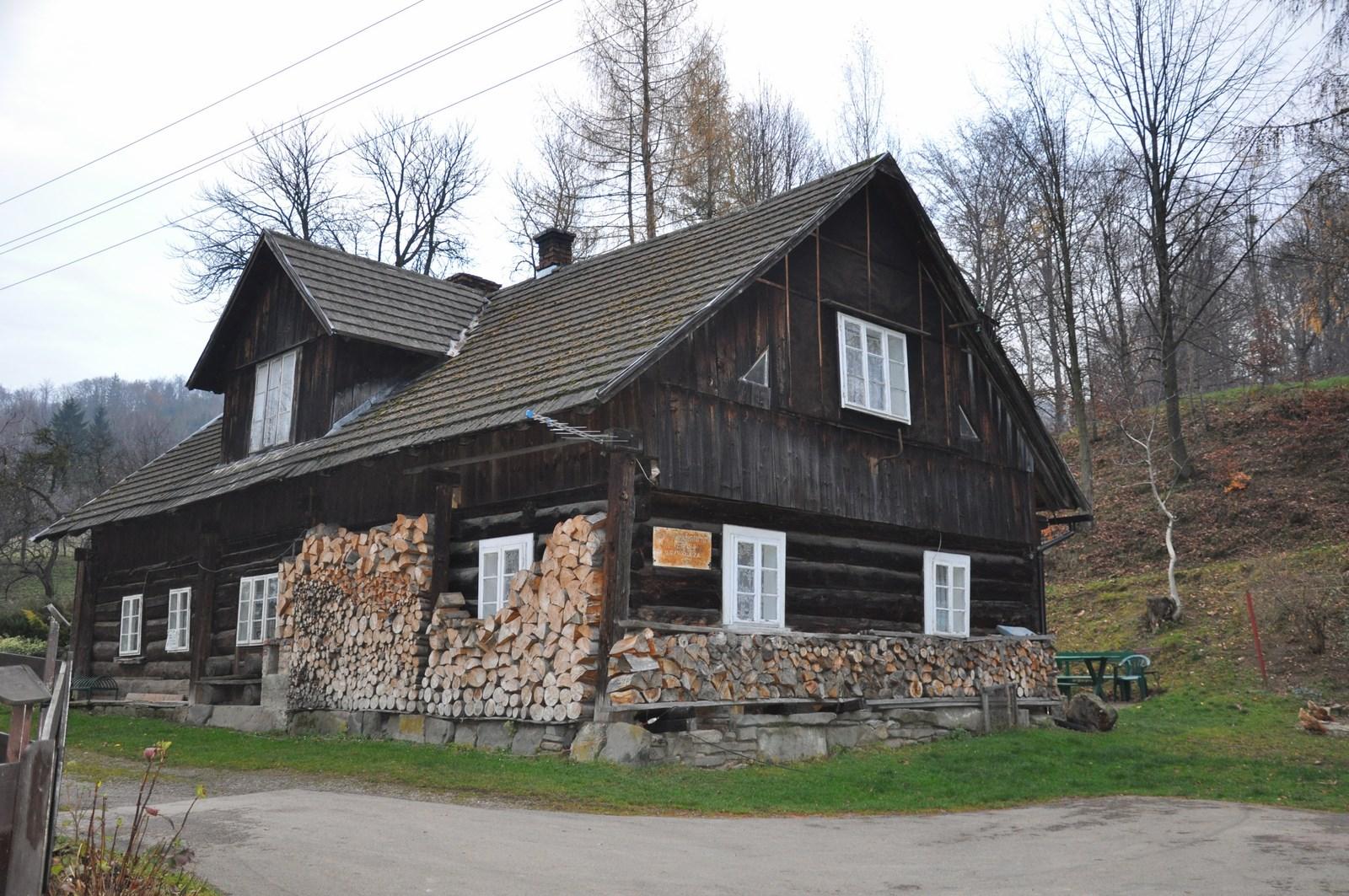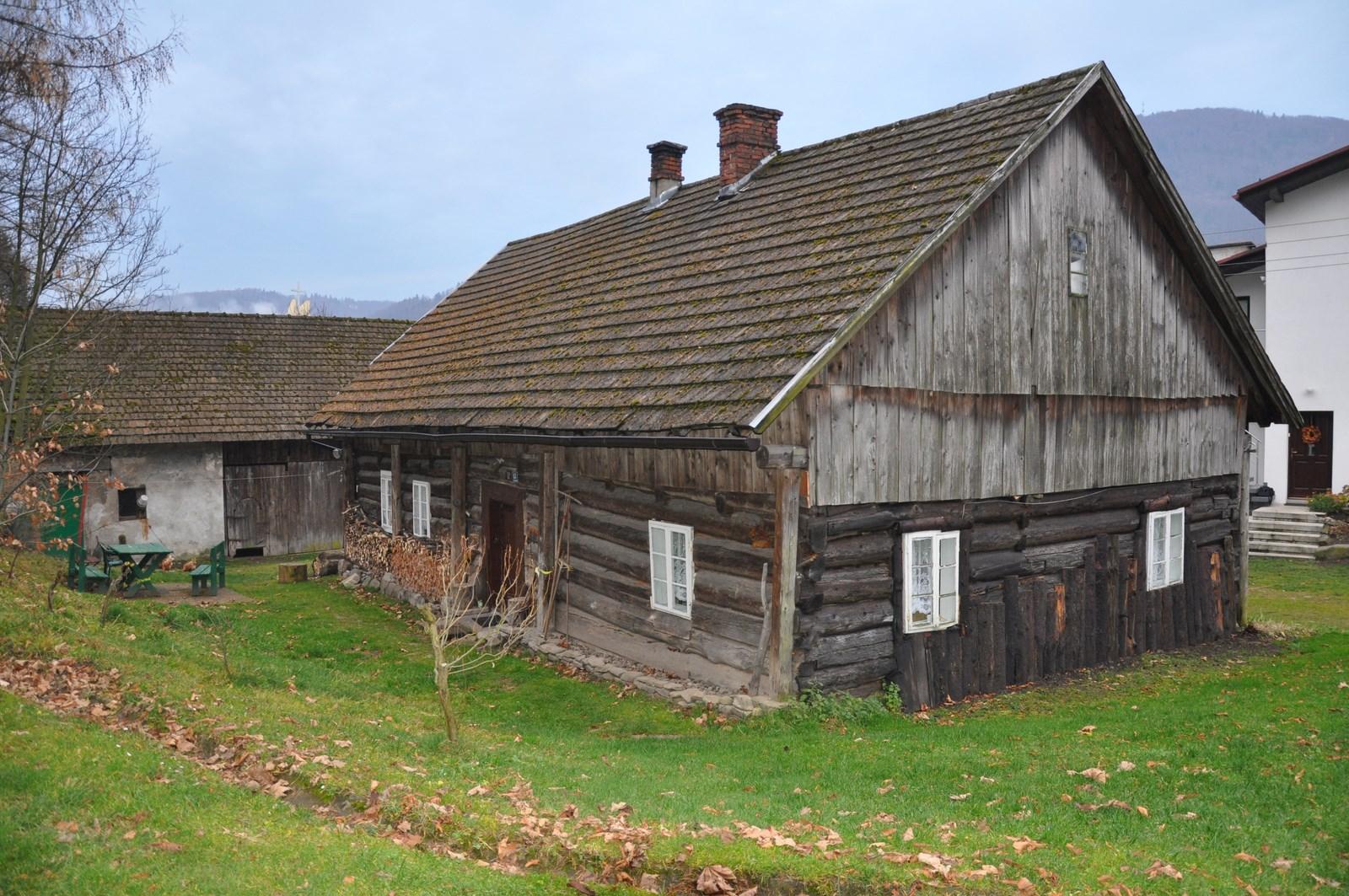 The building is made of wood, with a time-worn roof and a lumberyard at the elevation. In front of the entrance there is a small, green bench with a table. Next to the building there is a barn and a second residential building.
