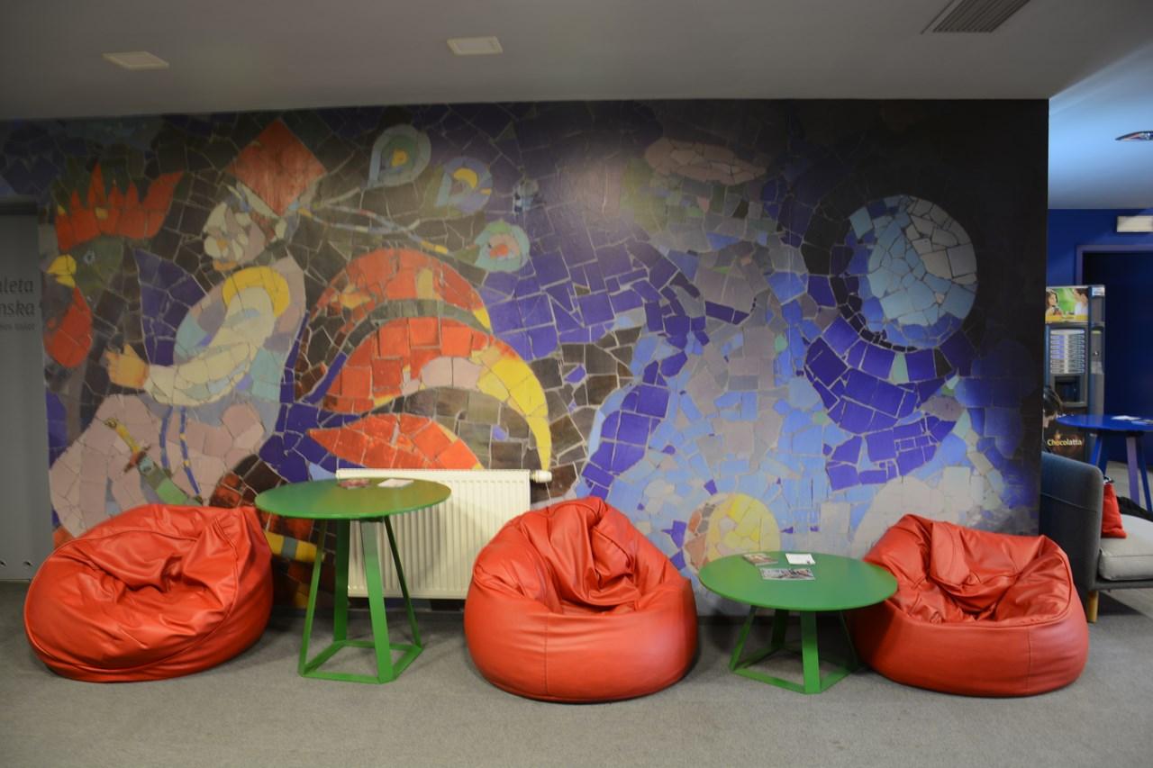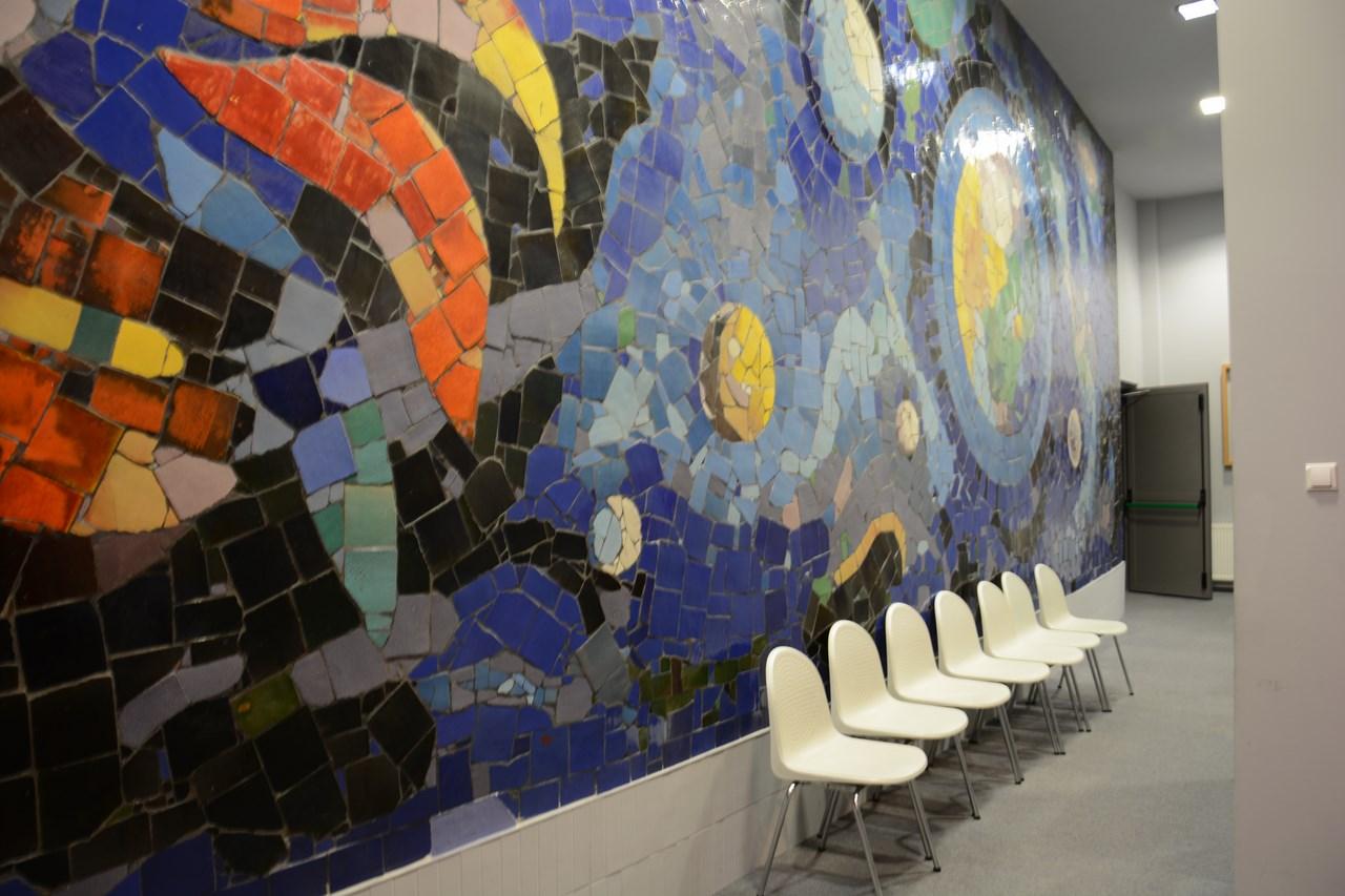 The movie theatres are preceded by the hall designed by the Wzorro Design studio based in Katowice. The interiors resemble the main architectural principles of the 50s and 60s, when the Kosmos Cinema was originally founded. What is more the architects preserved the distinctive mosaic presenting Pan Twardowski sitting on the cockerel.