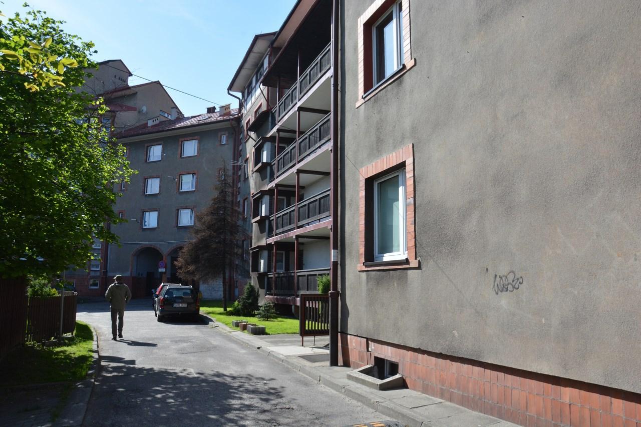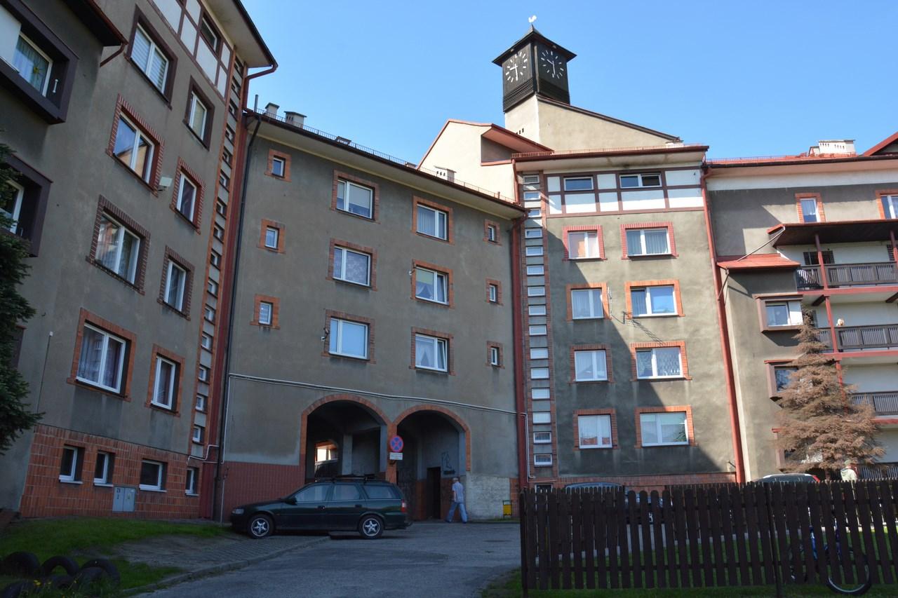There is an old, wooden clock on the top of the building’s roof. In front of the block of flats there are many parking spaces, double entrance gate, green square fenced with a wooden palings and a playground.