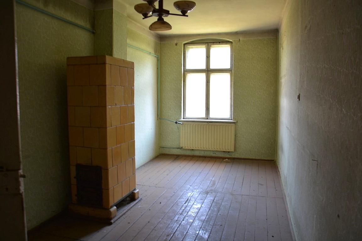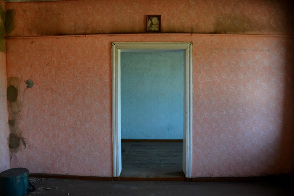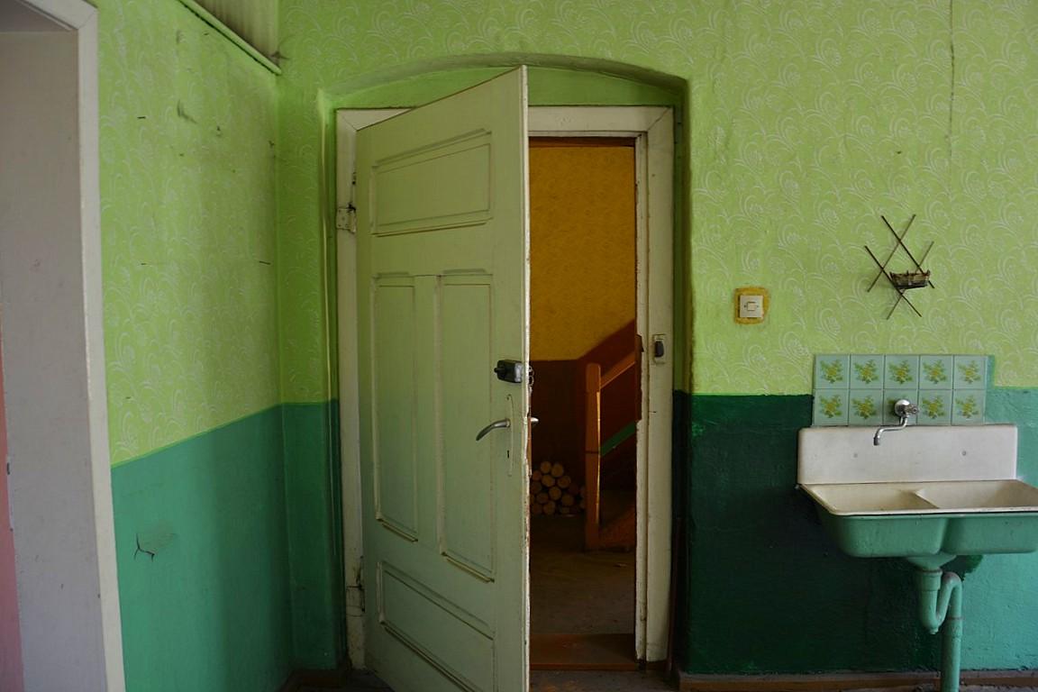 The interiors are worn out and not furnished. Currently the house is uninhabited. A green door covered with ivy leads to the house. The walls are covered with damaged wallpapers in bright colors: green, pink and blue. The rooms are well-lit thanks to big, wooden windows.