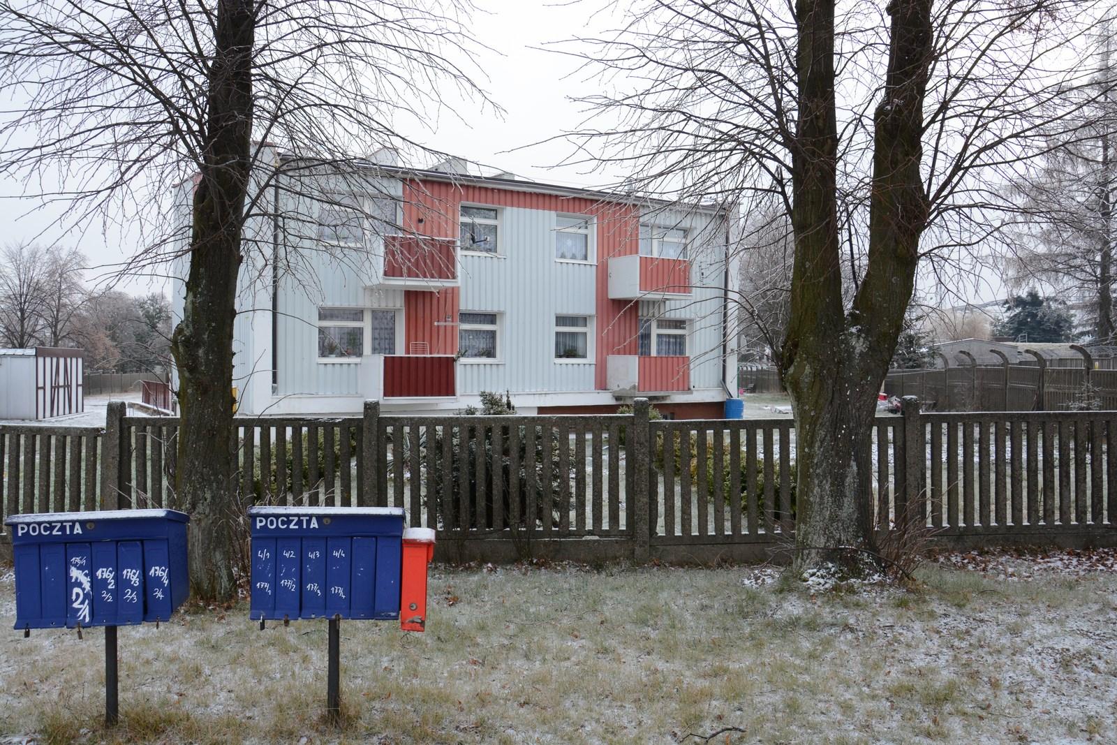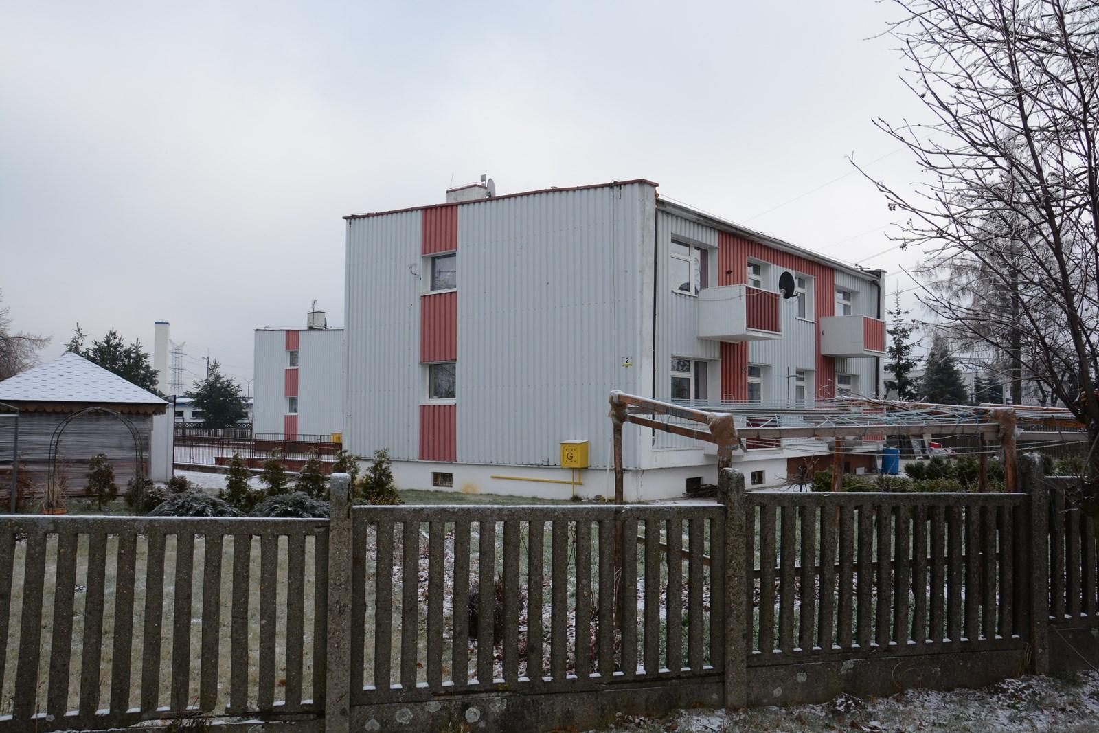 A residential block of flat covered with faded, corrugated sheet. A two-floor building is white with brown elements at windows and balconies. Te building is fenced and in the backyard there is a garden shed.