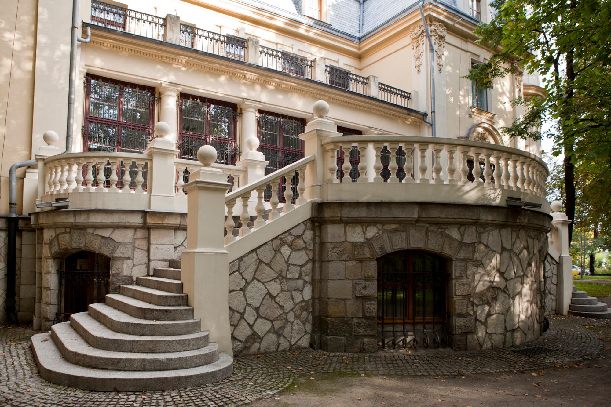 Beautiful, four storey , neo-Baroque palace was built on the square plan with the towers (with the tented roof) and mansard roof. The building’s elevation was decorated with the rich molding – leaf and oak fruit shaped decorations are dominant, the lower part of the elevation is marked by the stone facing. Face outlines and cartouches are visible on the elevation surface.