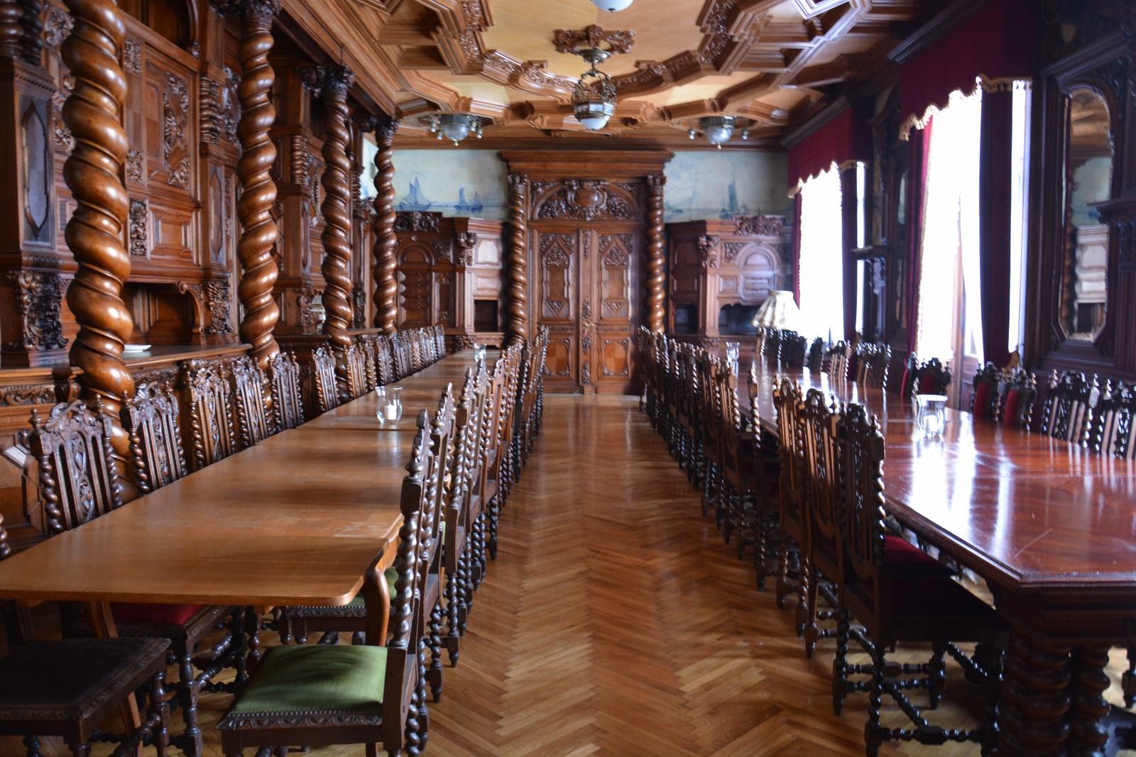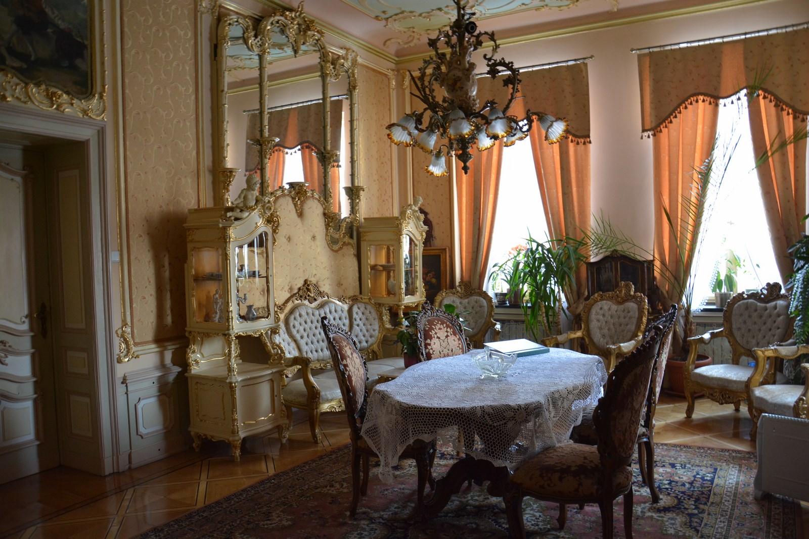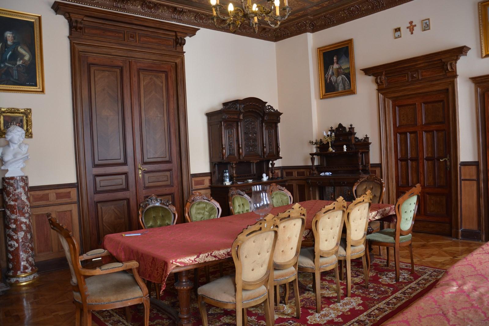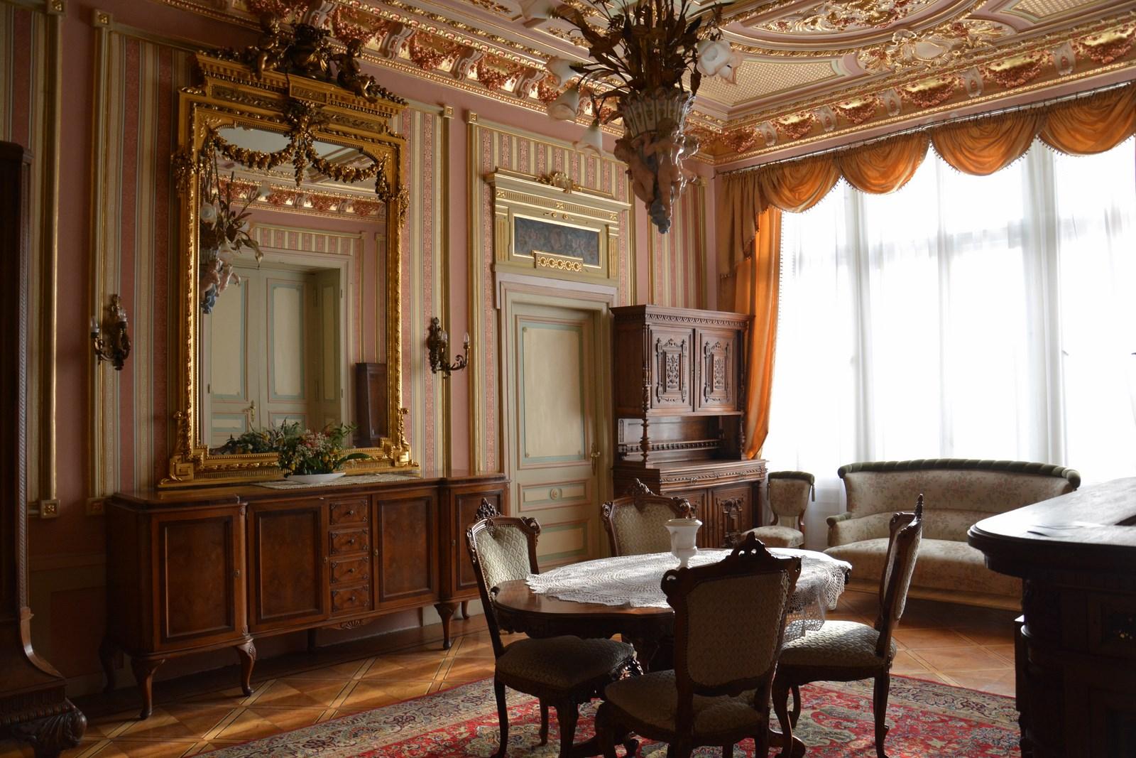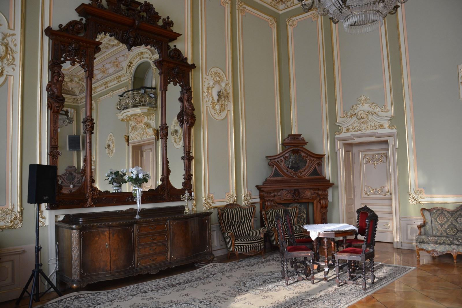 The palace consists of two elements: the higher, northern part and the wider, southern part. Elevations are made of brick with some plaster details and artificial stone. Part of the original furniture and interiors of the palace preserved to this day. We can find there a two-floor ball room decorated with stucco and mirrors, Neo-Baroque dining room, Neo-Romanesque pipe room decorated with wood panelling with floral and animal patterns and integrated shelves and seat, art nouveau room connected with a dining room decorated with a ceiling stucco and a richly decorated bathroom, which was used as a film set in a ‘Between the Cup and the Lip’ film.