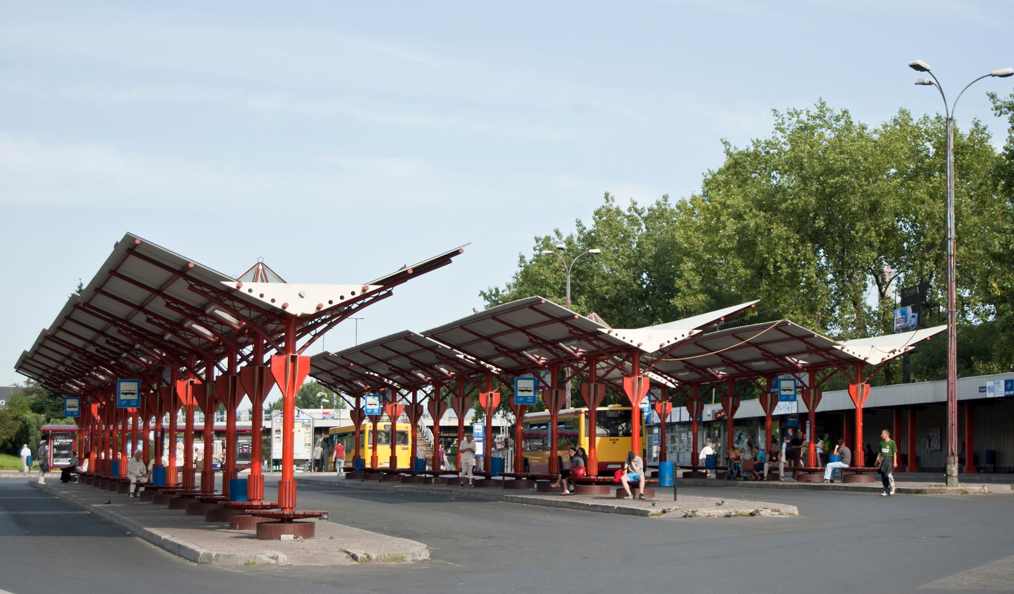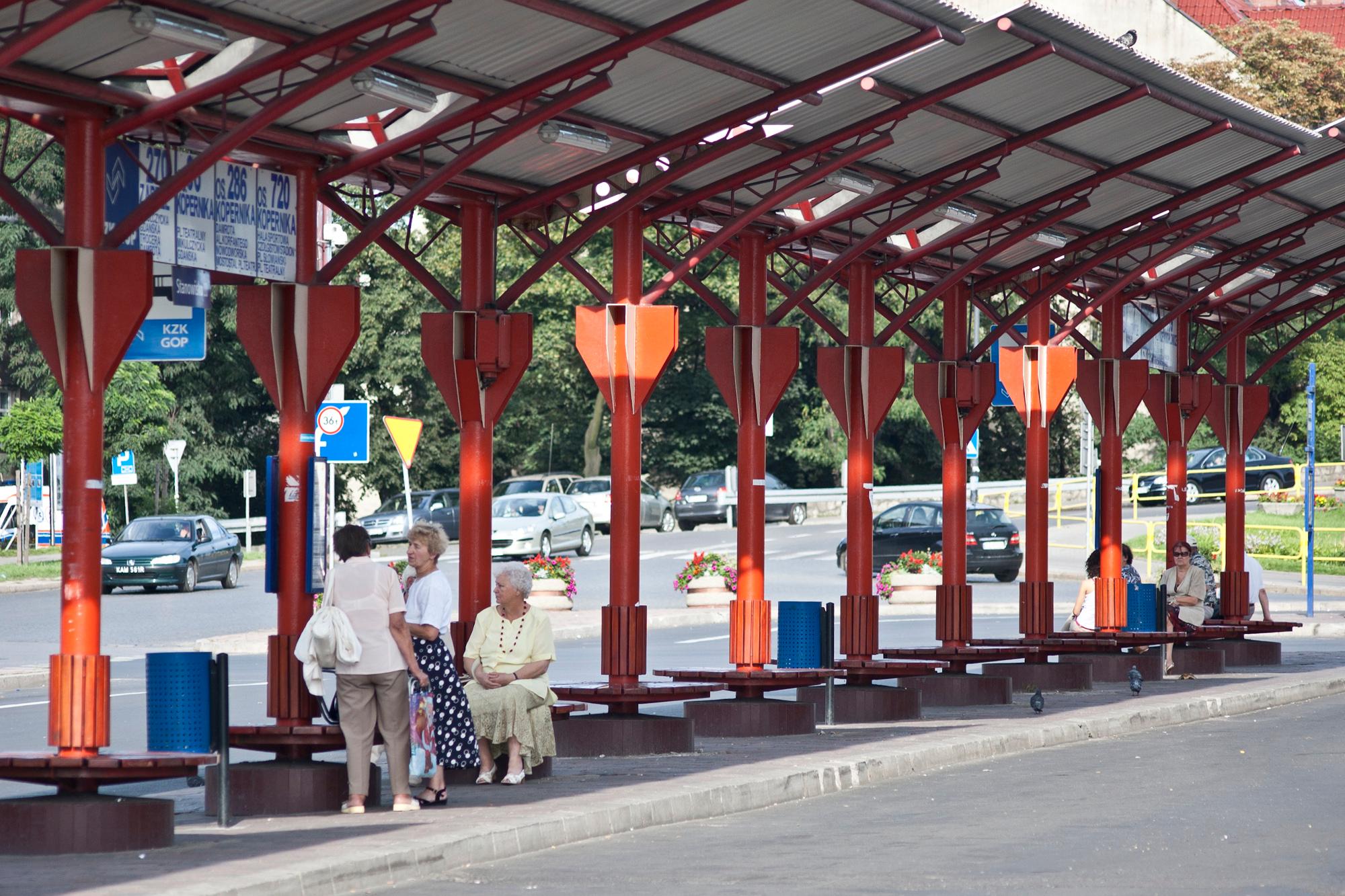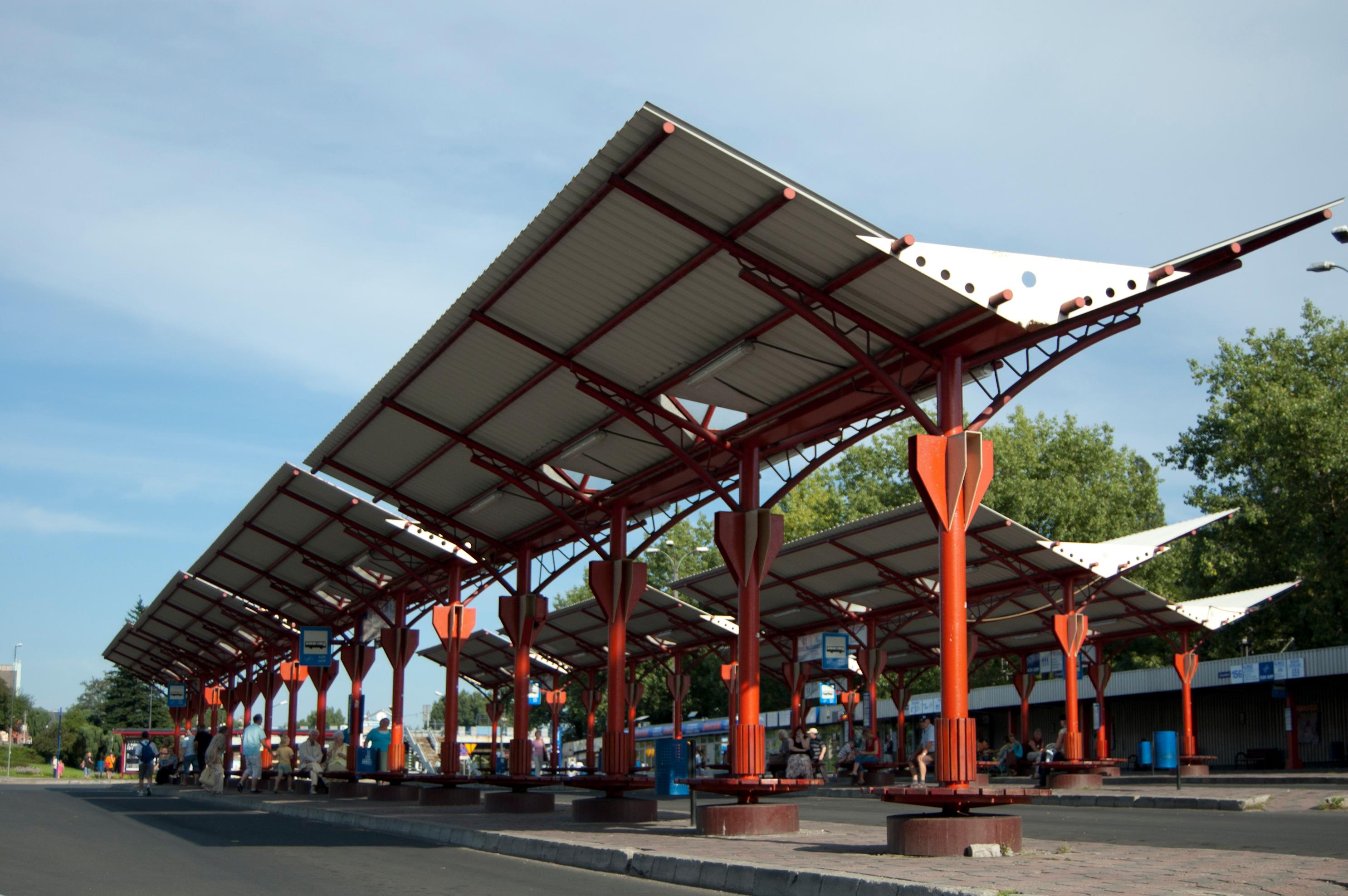 In its premises many bus stops together with the benches for the waiting passengers are located. Covered with the sheds. Red, metal carcass covered with the white metal sheets in the shape of the wings.