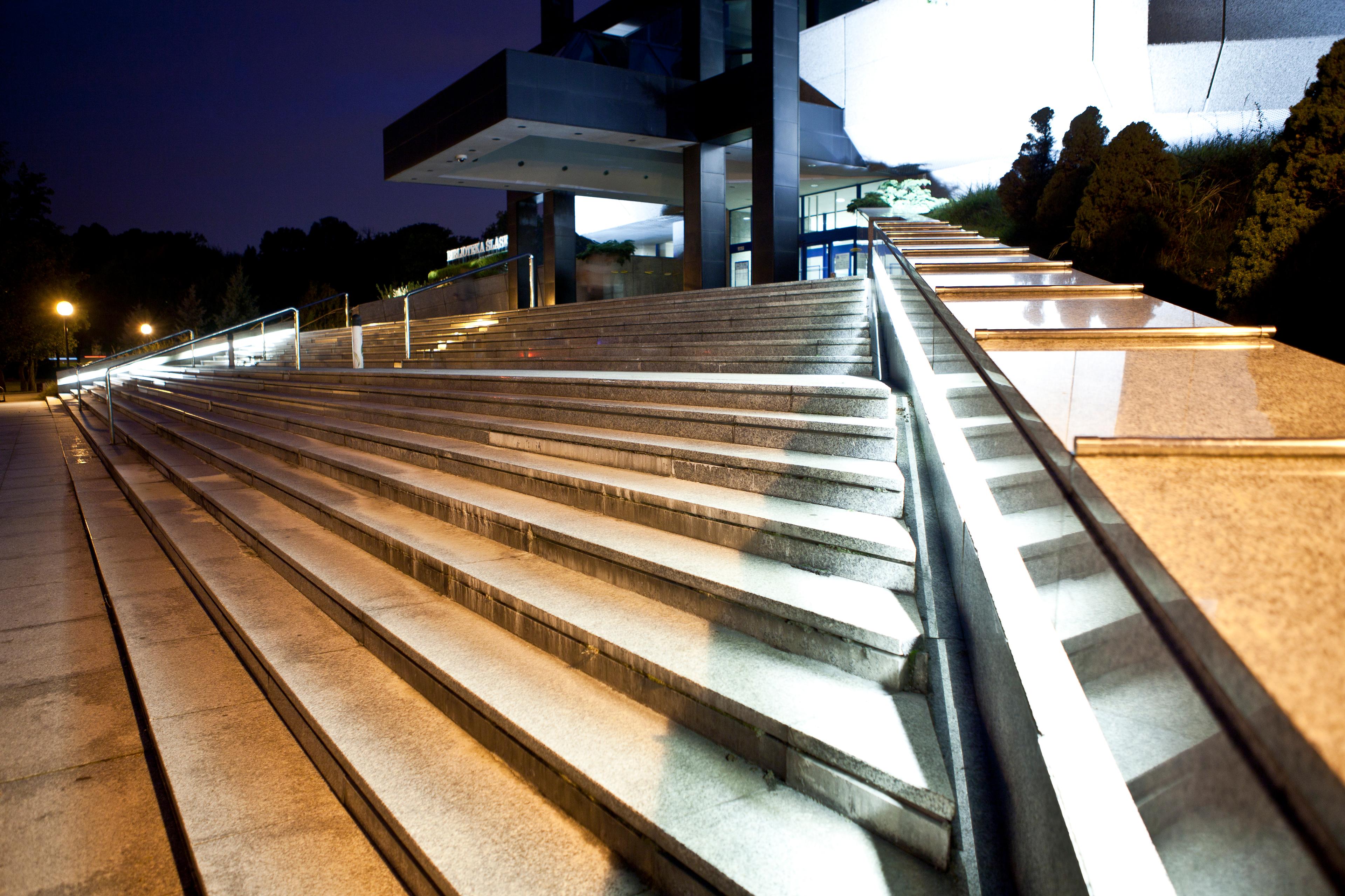In front of the building there are: concrete square, three flagpoles, stairs, parking lot. There is a big, green square divided by pavements with benches around the library.