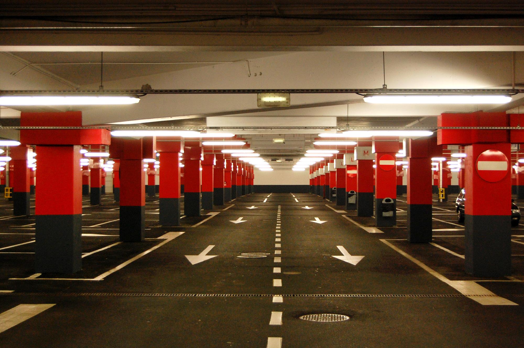 It has a capacity of 1200 vehicles. The supporting pillars are red while the floor is pewter. The parking places are numbered alphabetically. A shopping arcade can be entered through the sliding entrance/exit doors and the escalator.