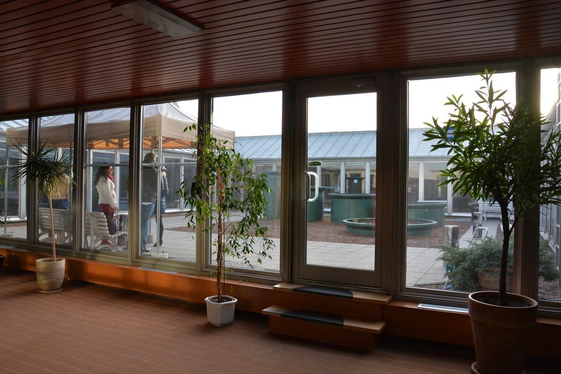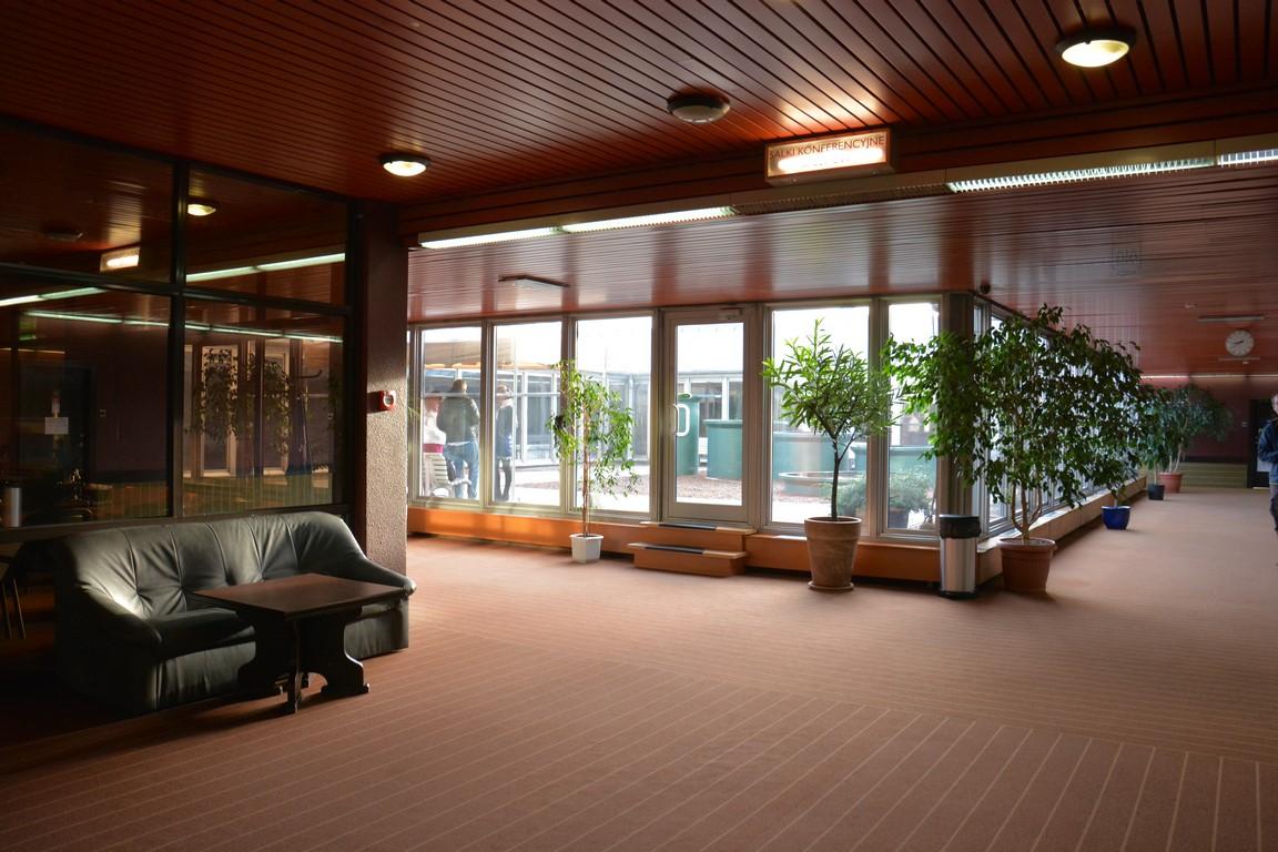 It features claret flooring with creamy stripes. The corridor provides entry to numerous office rooms and to a glazed patio which also serves as a smoking area.